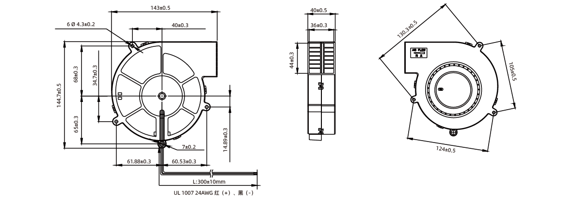 The 130*140mm blower fan is suitable for larger equipment and industrial instruments. The fan offers voltage options of 12V, 24V, and 48V, capable of running at high speeds, with a pure copper core for enhanced stability and reliability. It is ideal for environments requiring efficient cooling where noise is not a primary concern. The fan is constructed with heat-resistant plastic (compliant with UL 94V-0 standards) and features a dual ball bearing design, ensuring long-lasting performance across various applications.