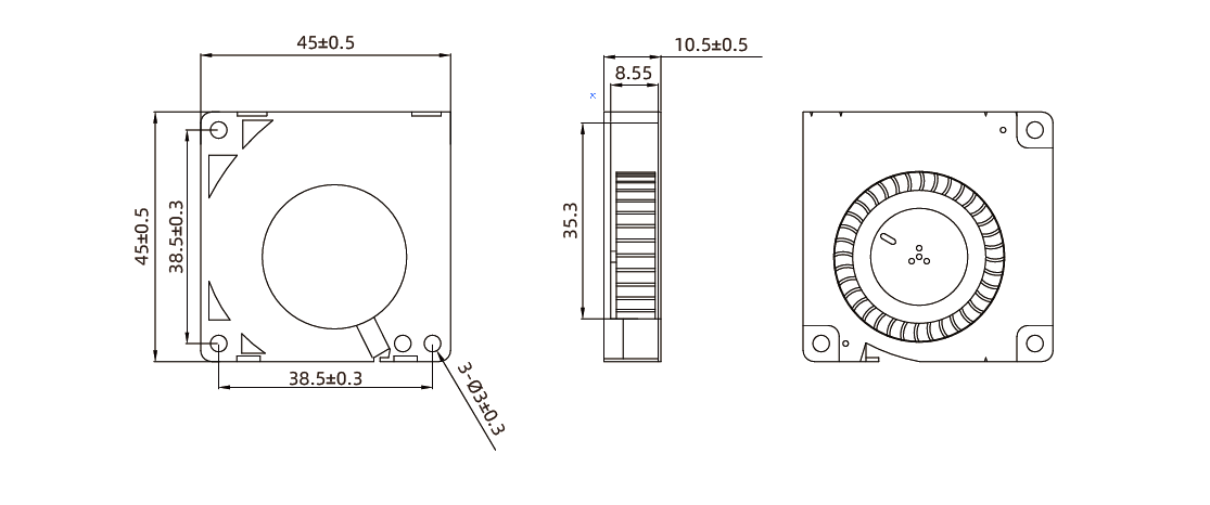 The 45x45mm DC brushless blower fan is a high-efficiency, compact cooling solution, ideal for meeting the cooling needs of electronic devices. The fan features a high-quality plastic frame and blades with heat-resistant and flame-retardant properties, ensuring stable operation in harsh environments. This model offers multiple voltage options (5V, 12V) and can reach a maximum speed of 9000 RPM, delivering strong airflow for effective heat dissipation. Additionally, the fan is designed for low noise, making it suitable for noise-sensitive applications.